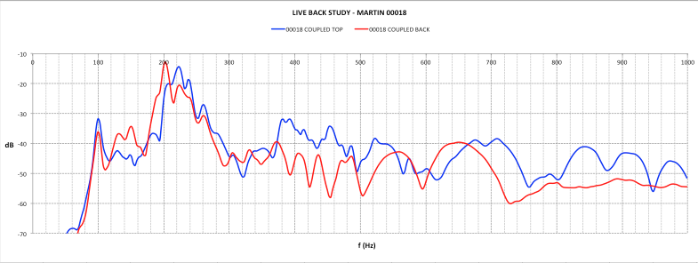 If the Martin has a live back, we’d expect the back to contribute to the overall tonal signature. In other words, some peaks in the back signature should imprint themselves onto the overall signature produced by tapping the top to simulate the impetus given by the strings when you play.