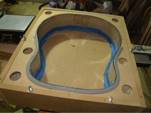 The experimental method uses a cavity made from sheet polycarbonate bent around the mould used for my Parlour guitar design. This cavity sits inside an outer box with the gap filled with sand to help damp out any vibration, since I am interested only in the response of the air-cavity as it is shaped by the soundhole. The sides and bottom of the containment box are 16mm MDF.