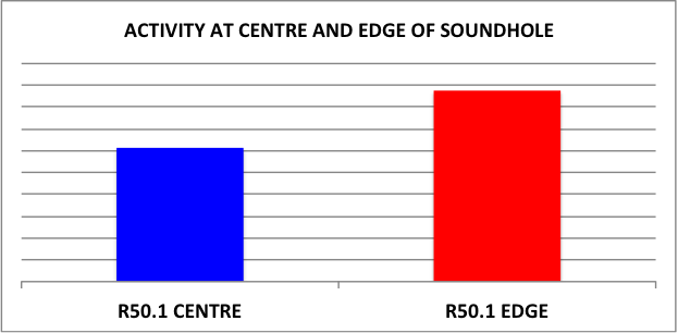 The next graph shows a comparison of the activity at the centre and the edge of the soundhole in arbitrary units, derived from the graph above, measured very close to the hole: