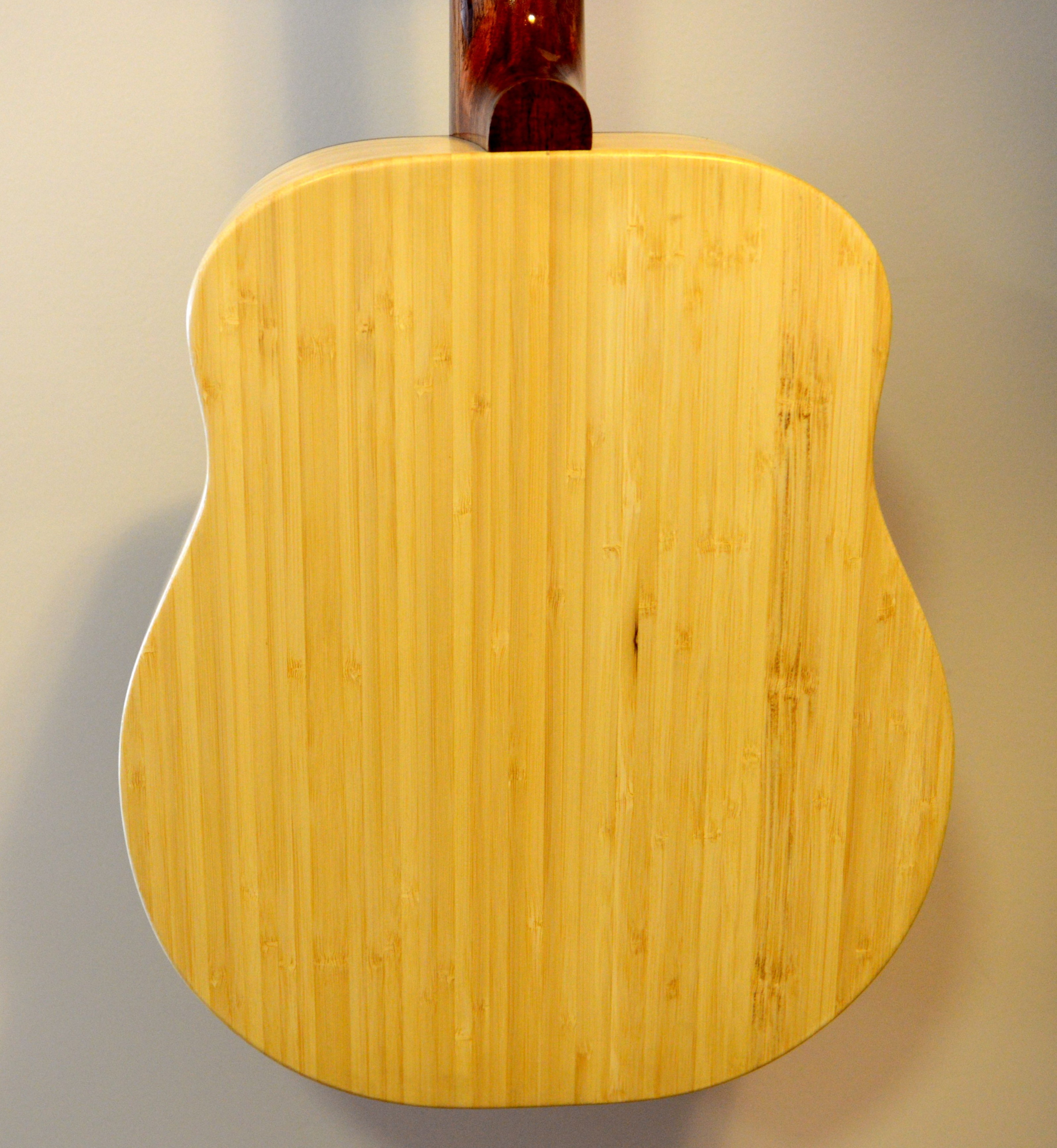 The soundbox has bamboo sides and back (standard guitar woods can also be used, of course), which contrasts boldly with the Niugini Rosewood neck: