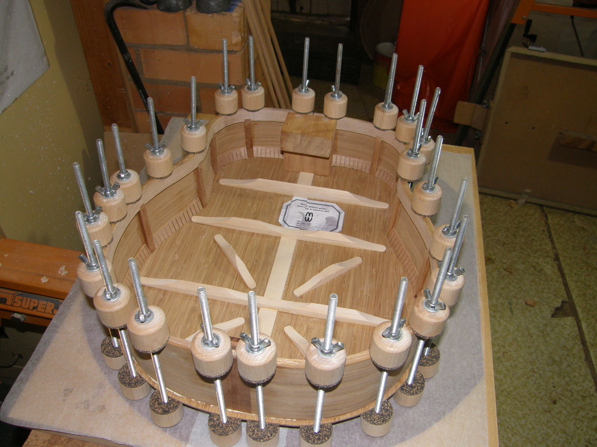 The sides of  the soundbox have already been shaped to match the curvature of the back plate (see The bamboo guitar – Part 6) so it’s now a matter of joining the two assemblies. Because I don’t use an edge binding to hide the joint, I need it to be a perfect fit and firmly clamped: