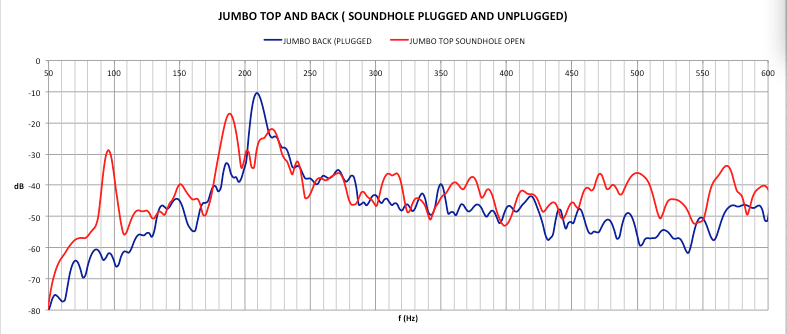 The outstanding feature of the back response is the peak at 210Hz, and maybe the overall response is higher there as a result. Maybe. The airbody response isn’t present because the soundhole is blocked.