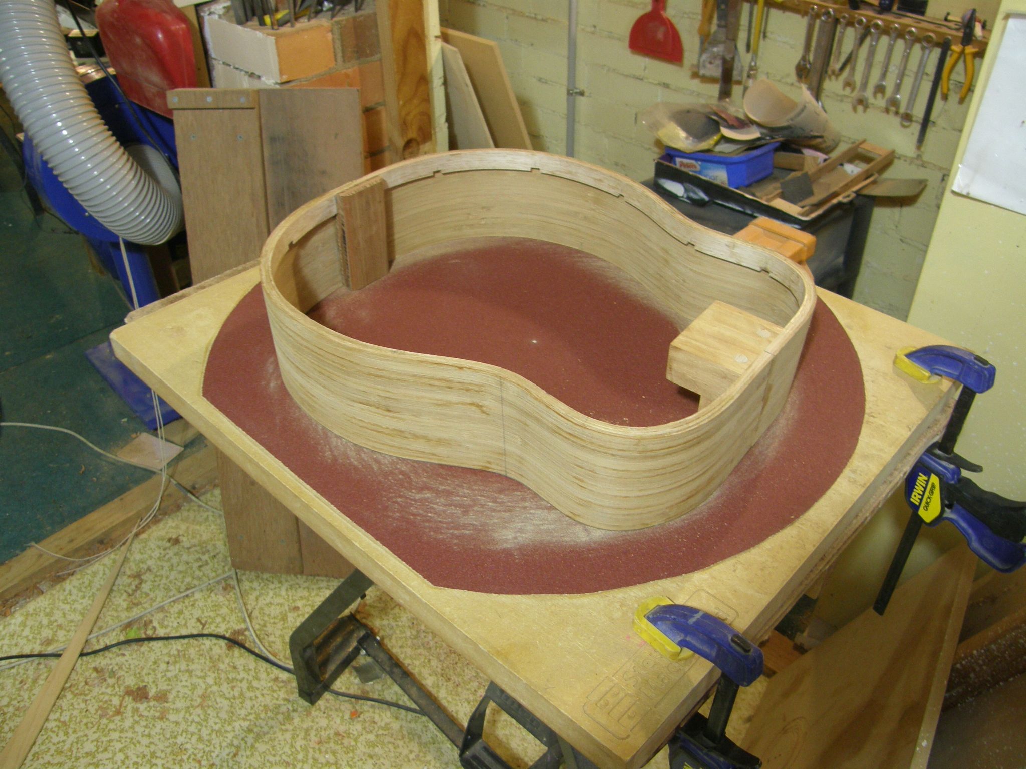 I make mine from two blocks of Niugini Rosewood joined at right angles and pinned vertically with two 9mm dowels, all held with Titebond glue. The reason for the shape is that the guitar will have a bolt-on-bolt-off neck, so there needs to be space for horizontal and vertical bolts to land. (In this picture the guitar is resting in sanding dish because I am profiling the bottom edge to the right curvature before fitting the side splints and the linings.)