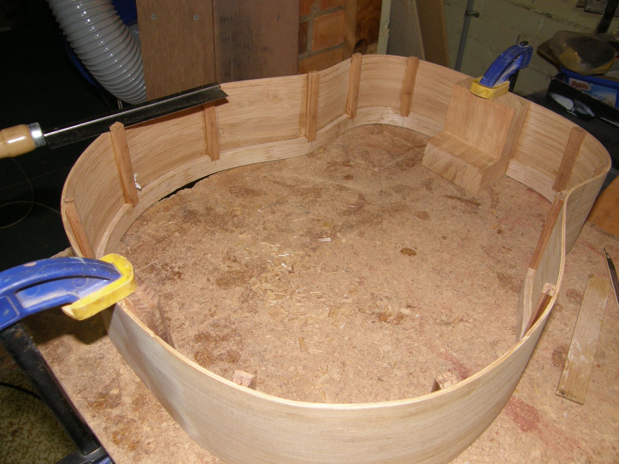 So I take my splints seriously now, where before I used to slap in a few little matchsticks made from scrap spruce and move on. I now laminate them from hardwood and notch them carefully into the top and bottom linings. I make them from three 2mm laminations of leftover Blackwood, so they’ll be the same 6mm thickness as the top linings. They’re 9mm wide, and carefully shaped to fit the  curvature of the sides.