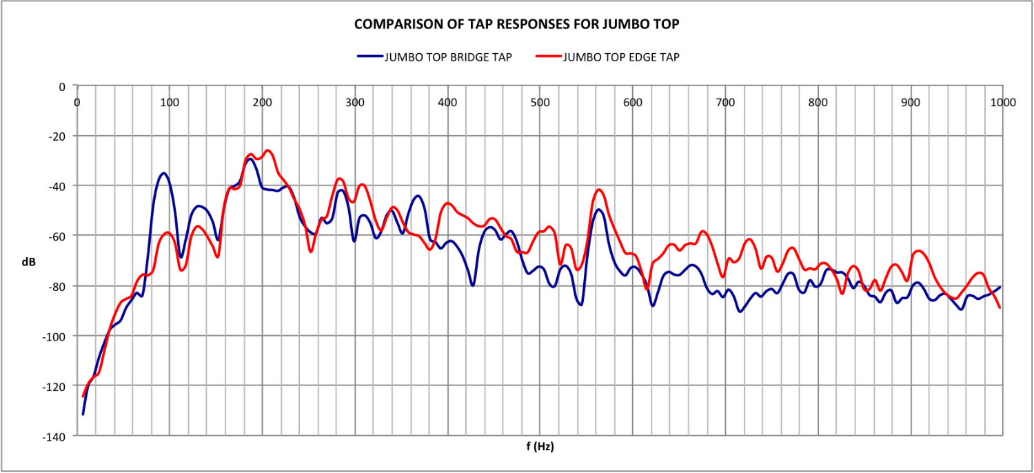 In this chart the blue line shows the response of my Jumbo 6 being tapped just behind the bridge, near the centre of the lower bout. The red line shows the response when tapped right at the edge. There are two main differences: